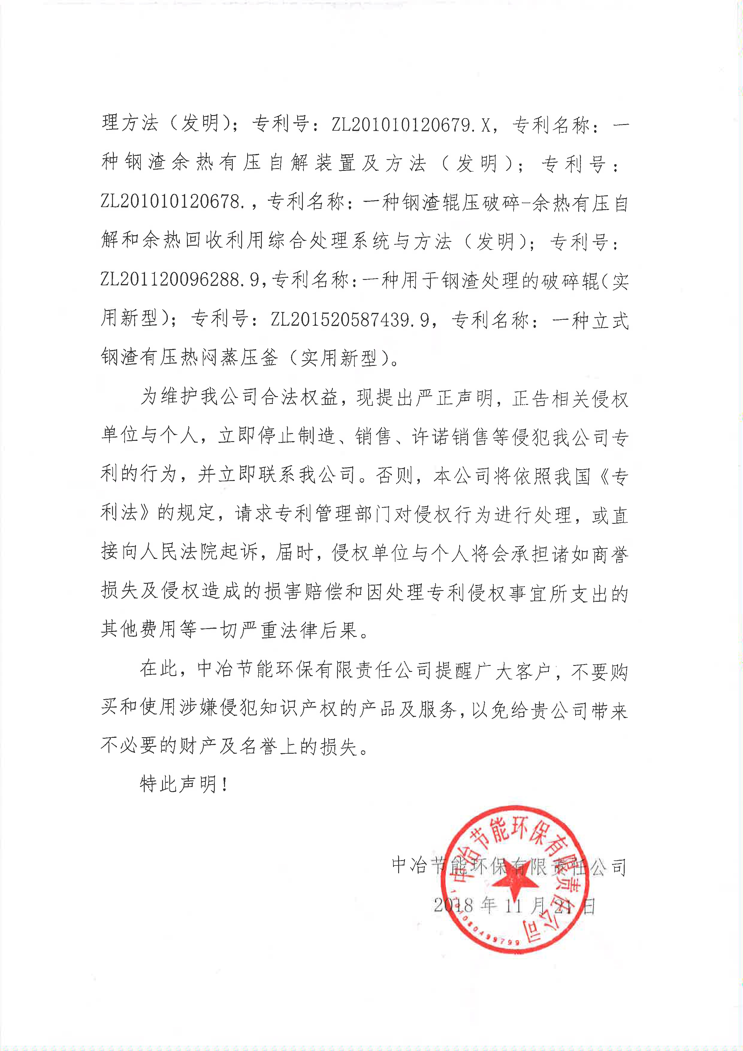 中冶節(jié)能環(huán)保有限責任公司關于專利維權的聲明